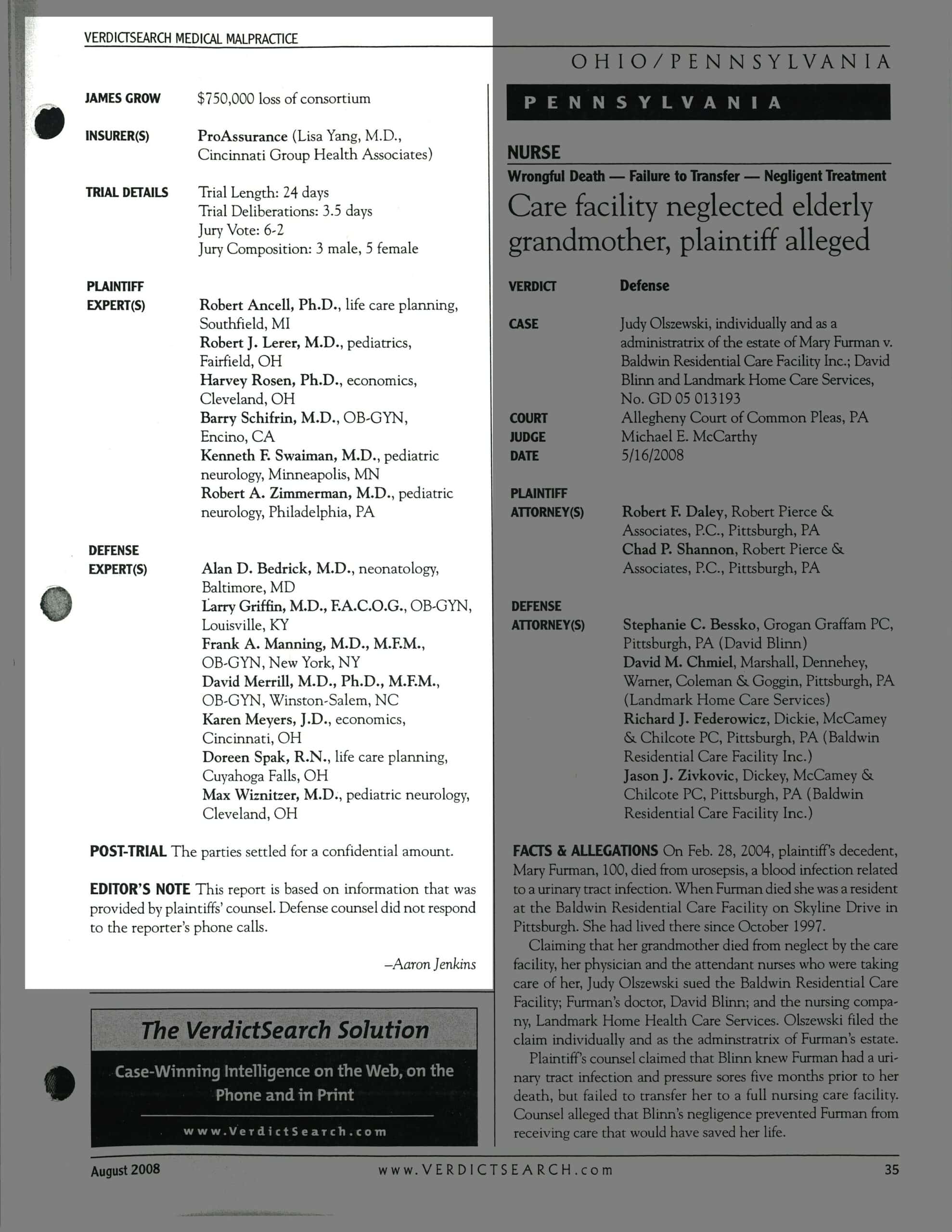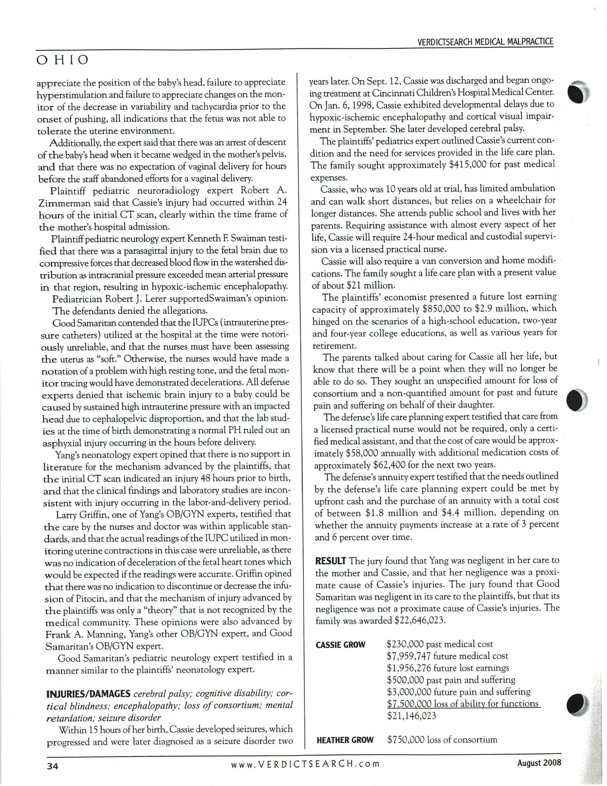 Pitocin misuse in C-section resulted in seizure injuries-Verdict Search-August 2008